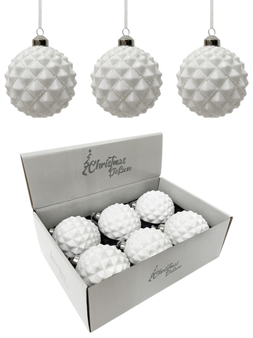 Набор стеклянных шаров, белый и матовый с серебряными ромбами д.10 см, 6 штук