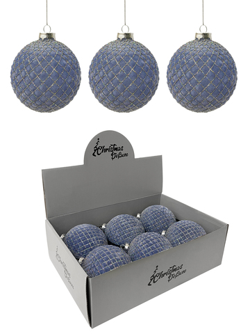 Набор стеклянных шаров, голубой с бархатной поверхностью и серебряными ромбами д.10 см, 6 штук