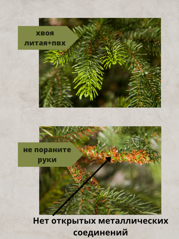 Торговая марка «Black Box», так же как «Triumph Tree» принадлежит группе компаний «K.EDELMAN B.V.» «Black Box» это 10 лет гарантии на данную модель и соответствие международным стандартам качества. Материал не мнется, не осыпается и прекрасно выглядит каждый раз, когда вы достаете елку из коробки. Искусственная елка Коттеджная 2,30м состоит из двух уровней, макушки и металлической подставки, обеспечивающей устойчивость модели. Конструкция выполнена по технологии «Hinge-on», т.е. крепление веток к стволу - шарнирное. Толщина веток рассчитана так, чтобы они не прогибались под тяжестью игрушек и гирлянд. Чтобы собрать елку, необходимо просто отогнуть ветки и расправить кончики. Поставляется елка в коробках из плотного картона, предполагающих многолетнее хранение. На каждой коробке нарисована инструкция по сборке и фотографии ели, так как она должна выглядеть в собранном виде. Ветки ели смиксованы из мягких и резиновых иголочек. Изящность модели придает елочке сходство с натуральным деревом.