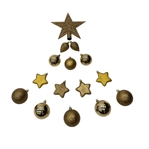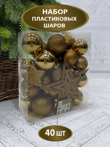 Декор новогодний, ёлочные украшения, набор с верхушкой в виде звезды состоит из шаров, звезд, шишек, в наборе 40 штук, цвет-бронзовый, прозрачный короб.