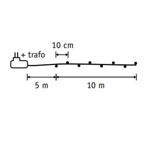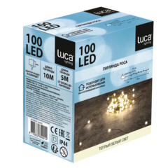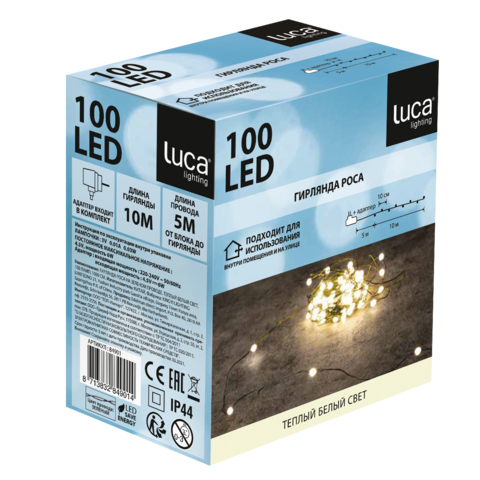 Новогодняя гирлянда электрическая нить светодиодная "Роса" 100 теплых белых мини-LED огней, зеленый провод, c адаптером, 10 м+3 м кабель. Электрогирлянда с LED-огнями(светодиодами) - класс защиты IP 44.
