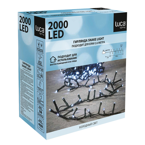 Гирлянда светодиодная многофункциональная Премиум PDQ SNAKE LIGHT LED 2000 огней холодных белых, рассчитанна для использования вне и внутри помещений (гирлянда уличная светодиодная морозостойкая, гирлянда нить светодиоднаядля для елки), контролер, 8 функций переключения режимов подсветки, длина провода 4000см, на елку от 260 см, торговая марка Luca lights, поставляется компанией Triumph Tree.
