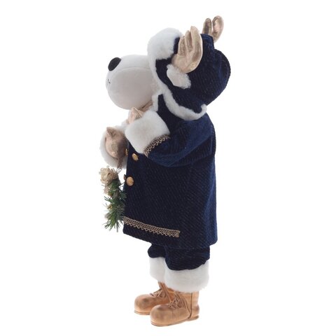 Игрушка новогодняя набивная "Олень" изображает очаровательного мальчика-олененка, одетого в синее вельветовое пальто с меховыми акцентами. Золотые рога, варежки и сапожки добавляют его образу неповторимый шарм. На голове у него синяя шапка-ушанка, украшенная мехом, а в руках он держит новогоднюю ветку, что создает яркое ощущение праздника.