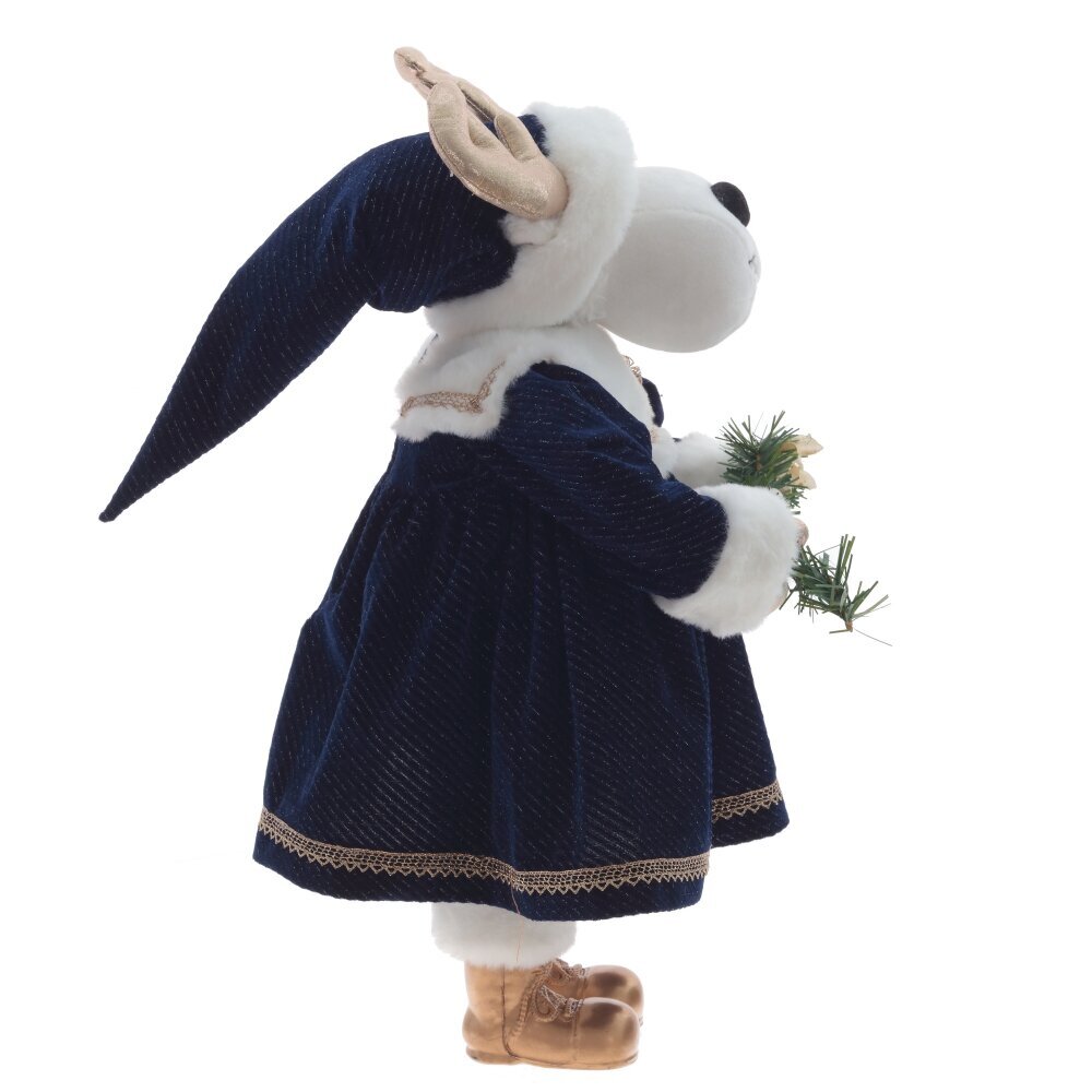 Игрушка новогодняя набивная "Олень" представляет собой милую девочку-олененка в синем вельветовом платье с меховыми деталями. Золотые рога, варежки и сапожки придают образу особый шарм. На голове длинный синий колпак также с меховой отделкой, а в руках у девочки-оленя новогодняя ветка, создающая атмосферу праздника. Она станет изысканным акцентом в любом интерьере — будь то стильная гостиная, уютная детская комната или праздничный уголок, украшенный к Новому году.