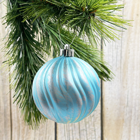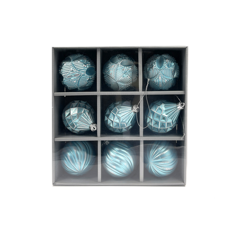 Набор елочных украшений из пластика голубой с серебряной патиной под плексом, 9 штук, д.8-9 см