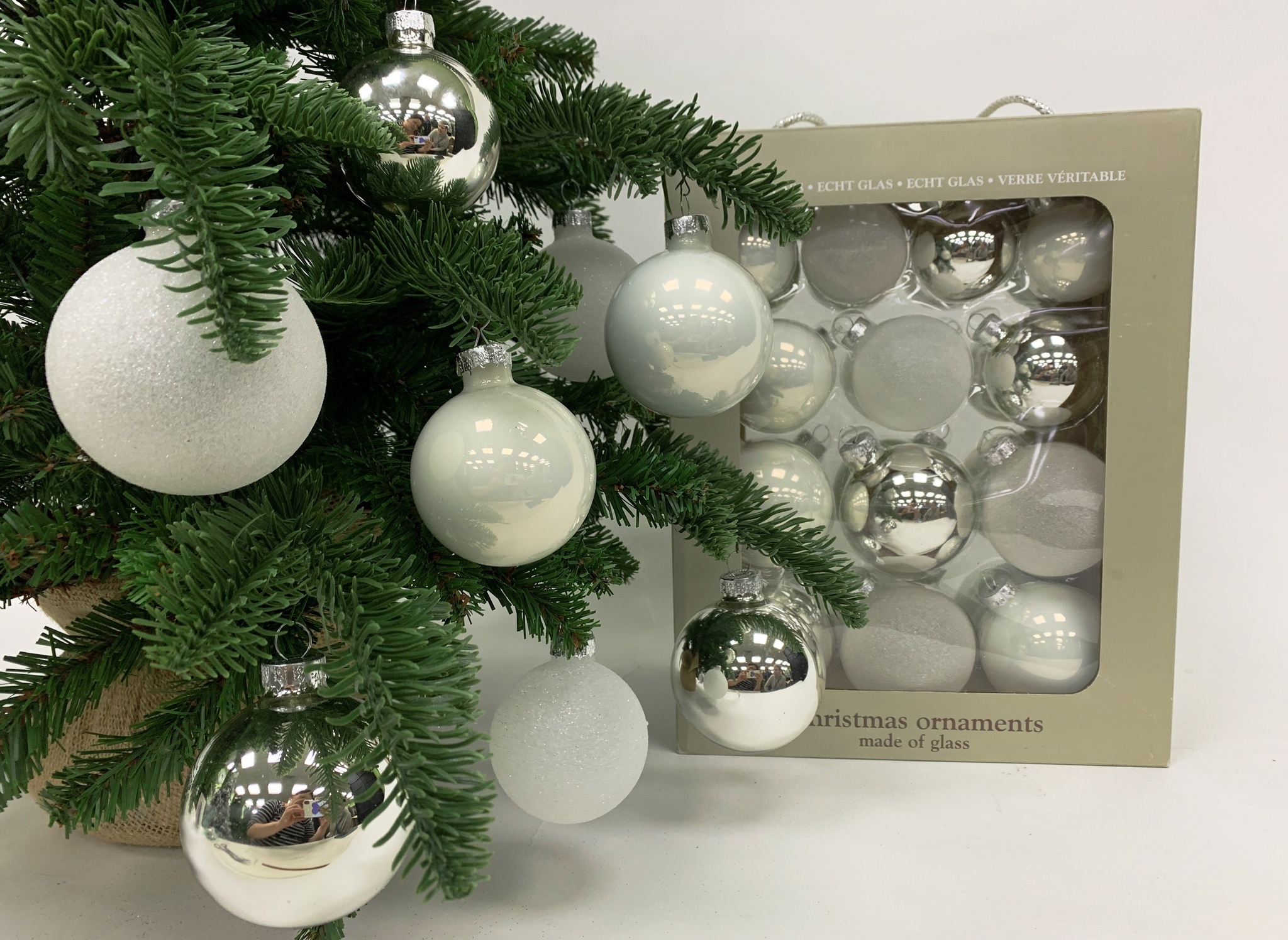 Новый год со стилем! Подарите себе и близким волшебство с элегантным набором ёлочных шаров от бренда **ChristmasDeluxe** – это 26 белоснежных украшений с серебром внутри, которые подчеркнут праздничную атмосферу вашего праздника. Изделия выполнены вручную из стекла. Изящные узоры переливаются при свете гирлянд, создавая чарующую зимнюю сказку прямо у вас дома.