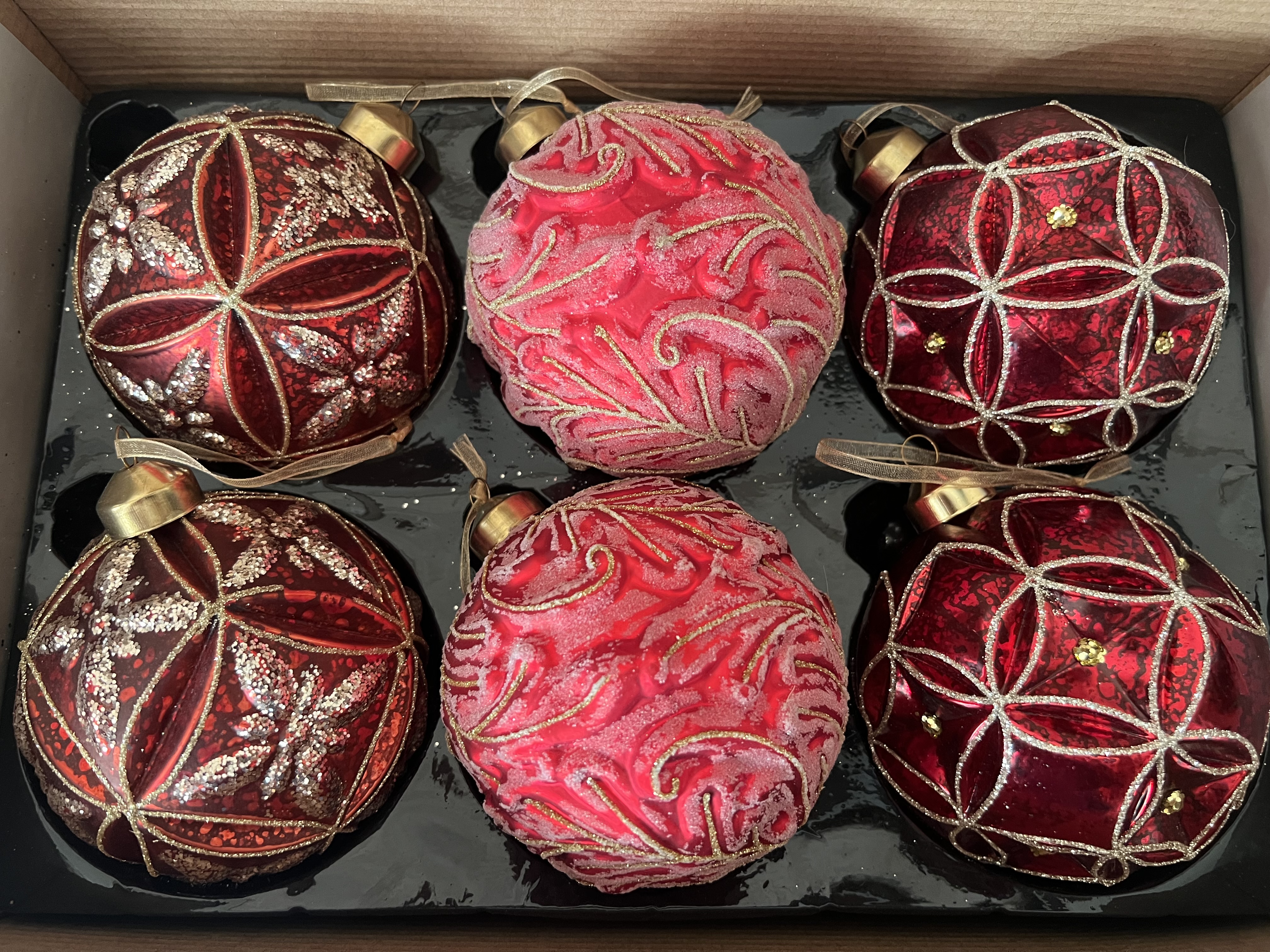 Этот великолепный комплект от бренда ChristmasDeLuxe станет изысканным украшением вашей ёлки! Яркие элементы из качественного стекла красного цвета с золотыми узорами и припорошеныснегом , прекрасно подойдут как для классического, так и современного праздничного интерьера. В комплекте – шесть шаров, что позволит создать неповторимый декор. Под брендом ChristmasDeLuxe выпускается продукция фабричного производства, обеспечивающая отличное качество изделий.