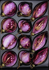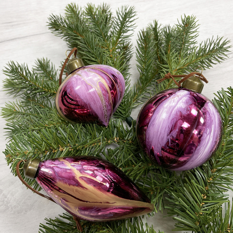Набор стеклянных шаров малиновый с разводами д.8 см, 12 штук, ассортимент из 3-х видов.