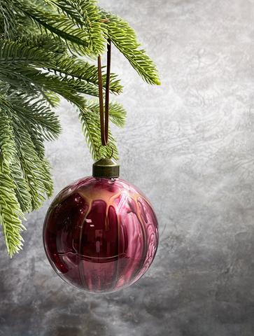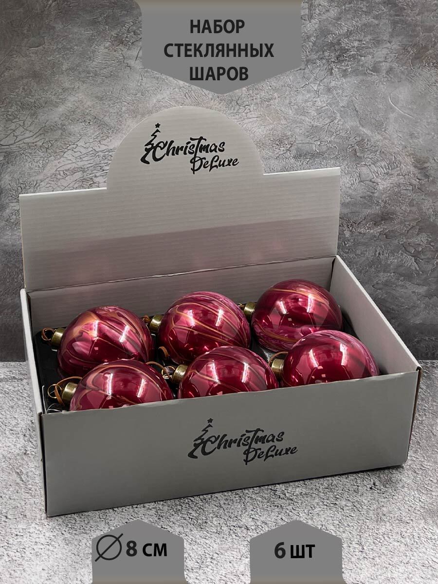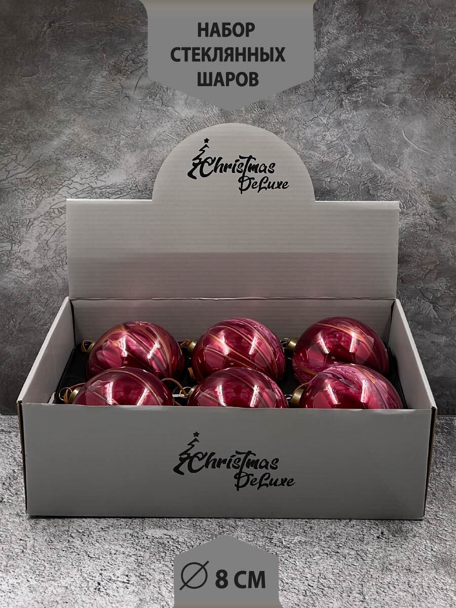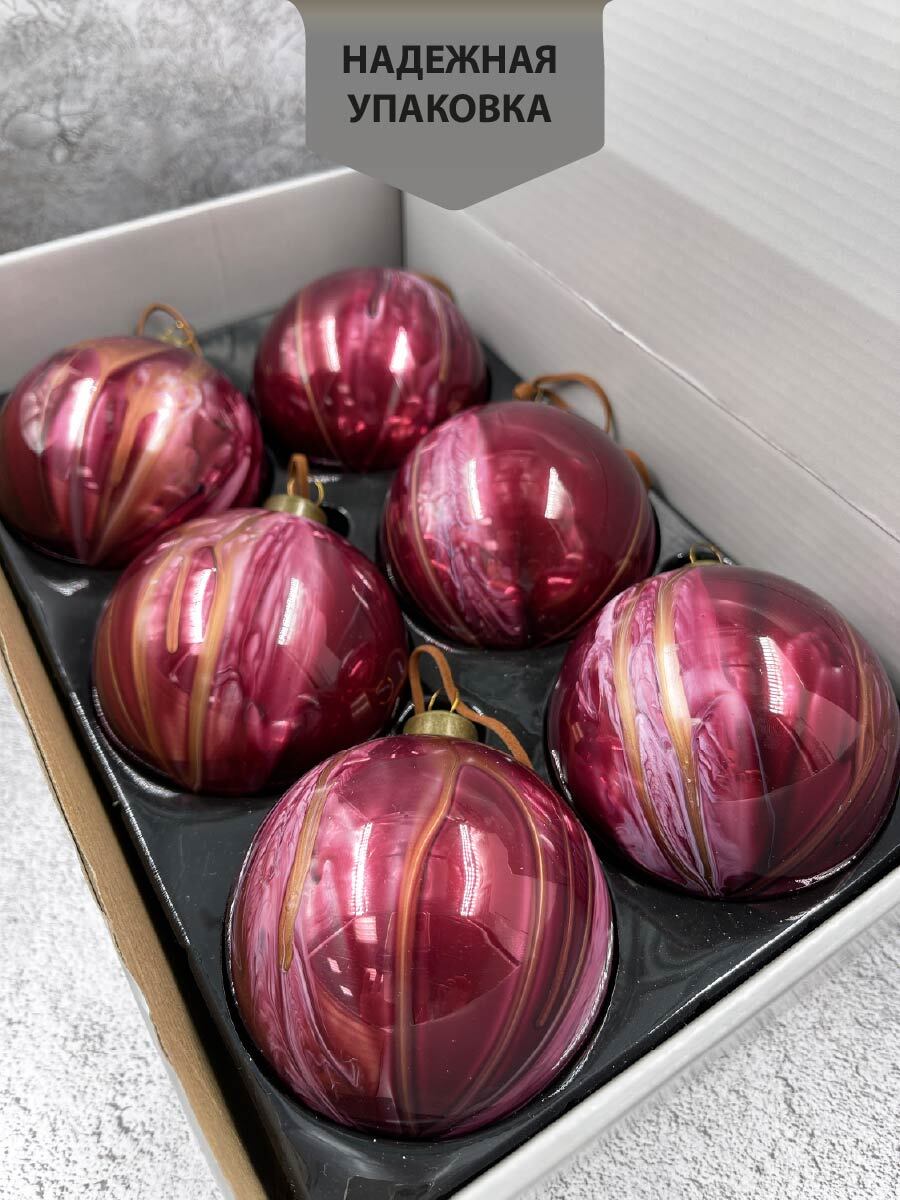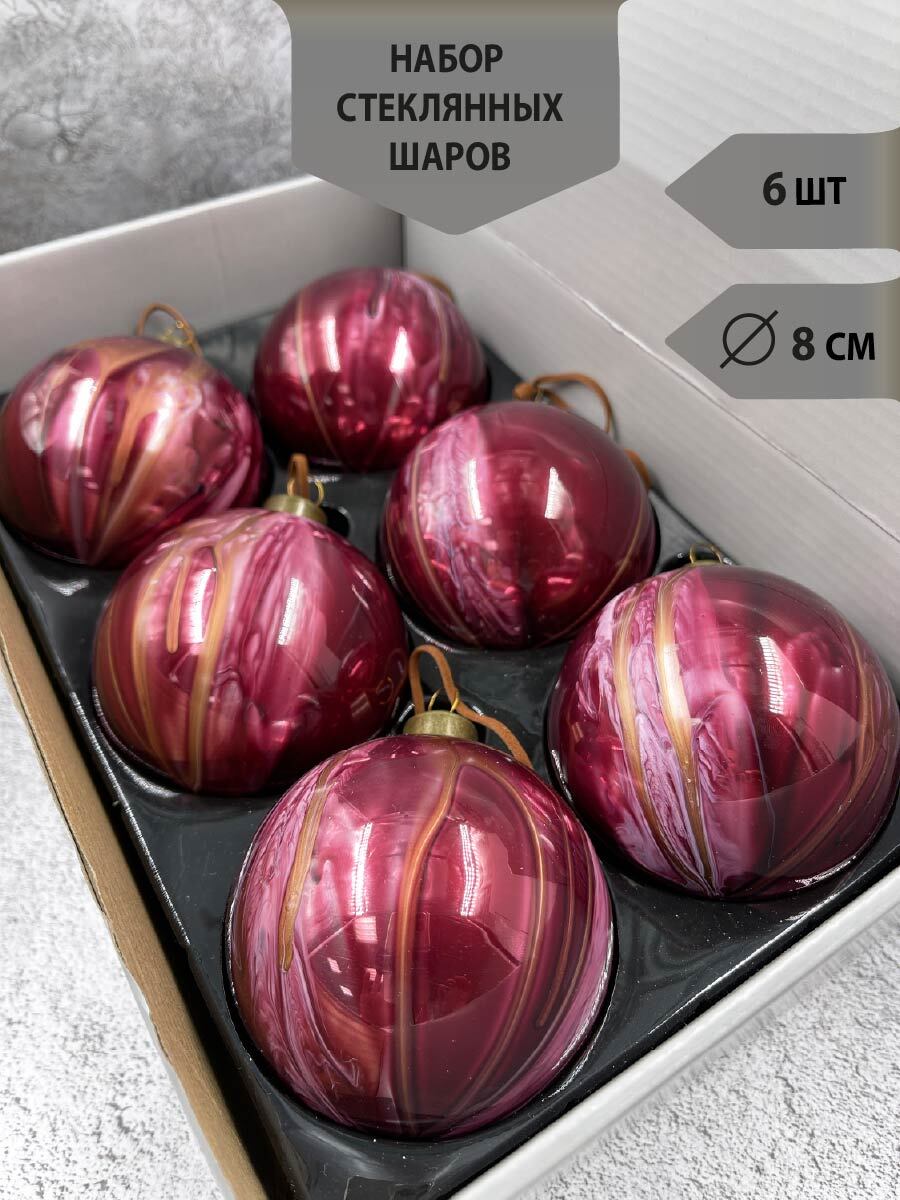 Новогодний декор, набор стеклянных елочных шаров диаметр 8 см, 6 штук, цвет малиновый с разводами.