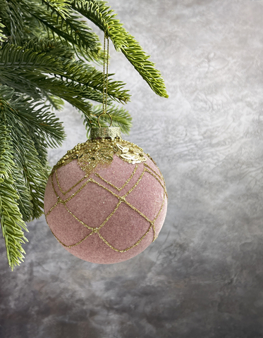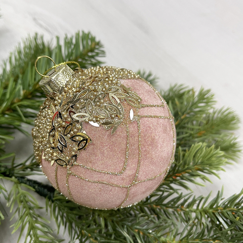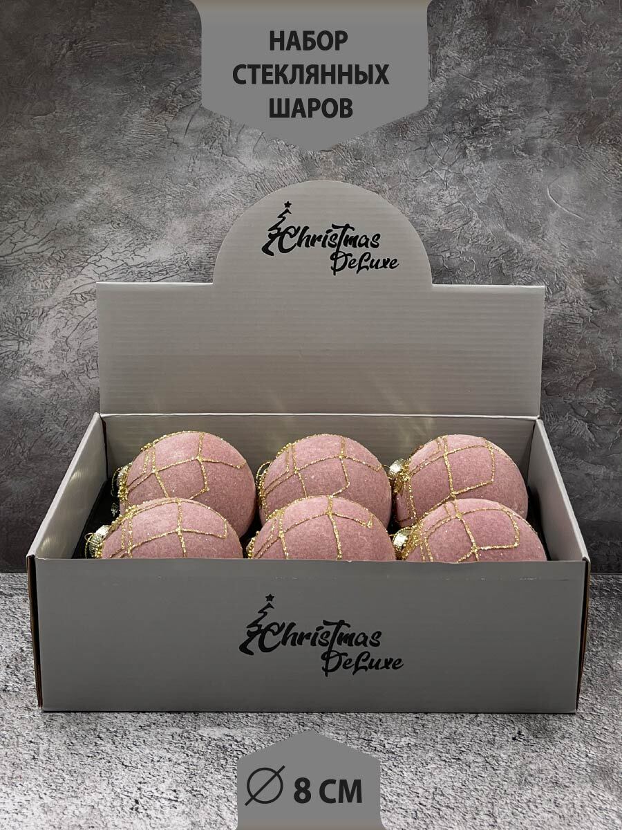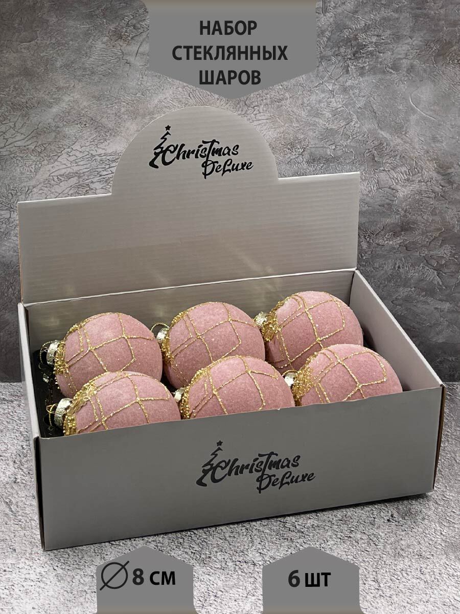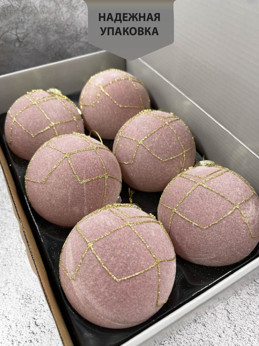 Новогодний декор, набор стеклянных елочных шаров диаметр 8 см, 6 штук, цвет пудровый с бусинками.