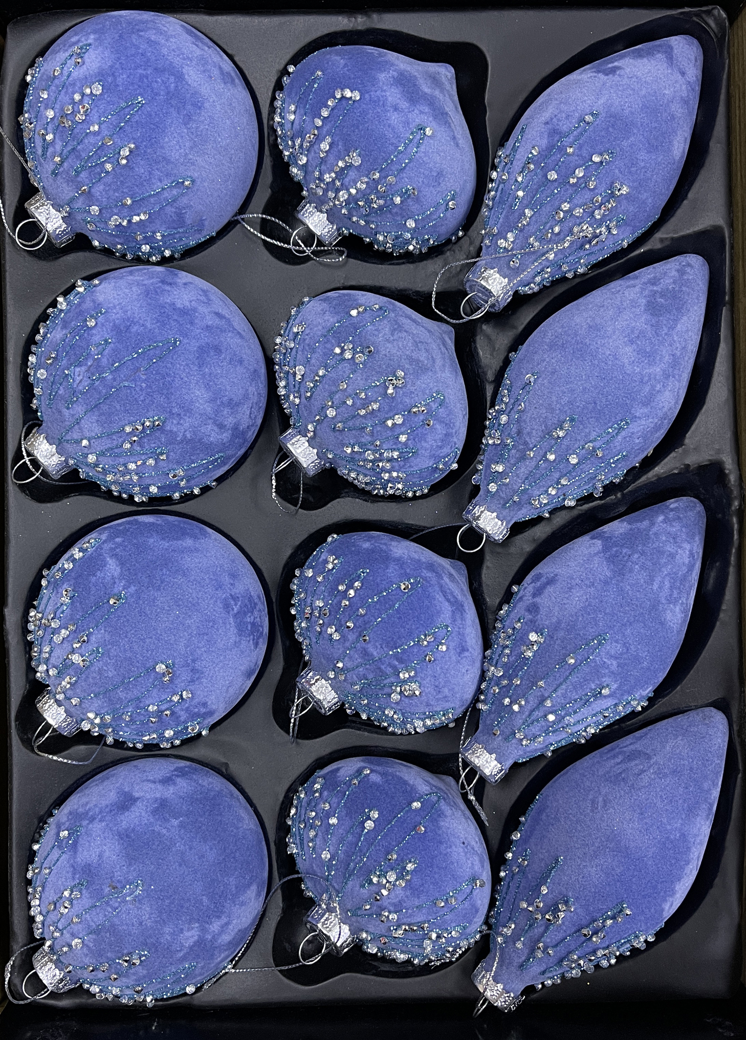 Набор стеклянных шаров синий со стразами д.8 см, 12 штук, ассортимент из 3-х видов.