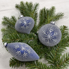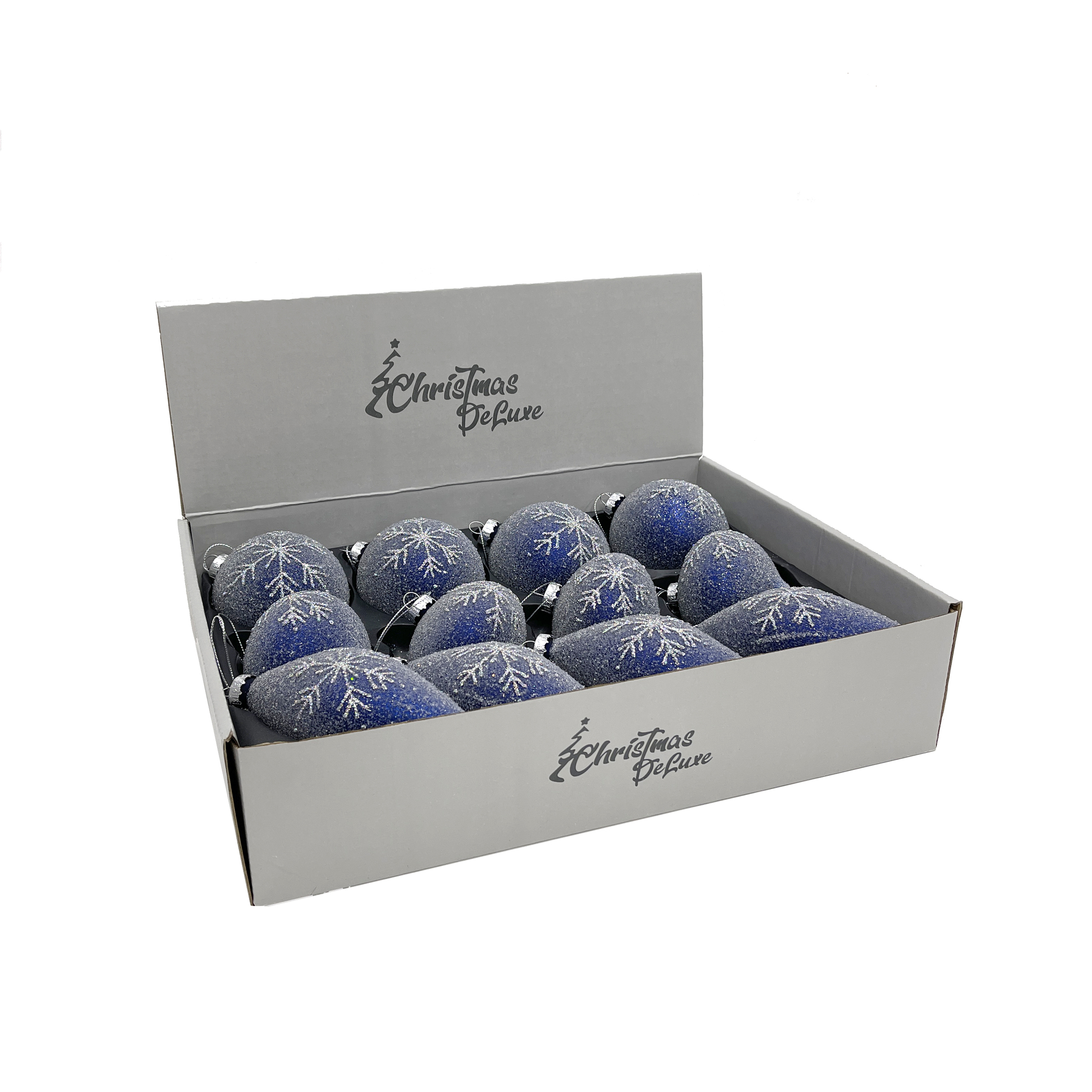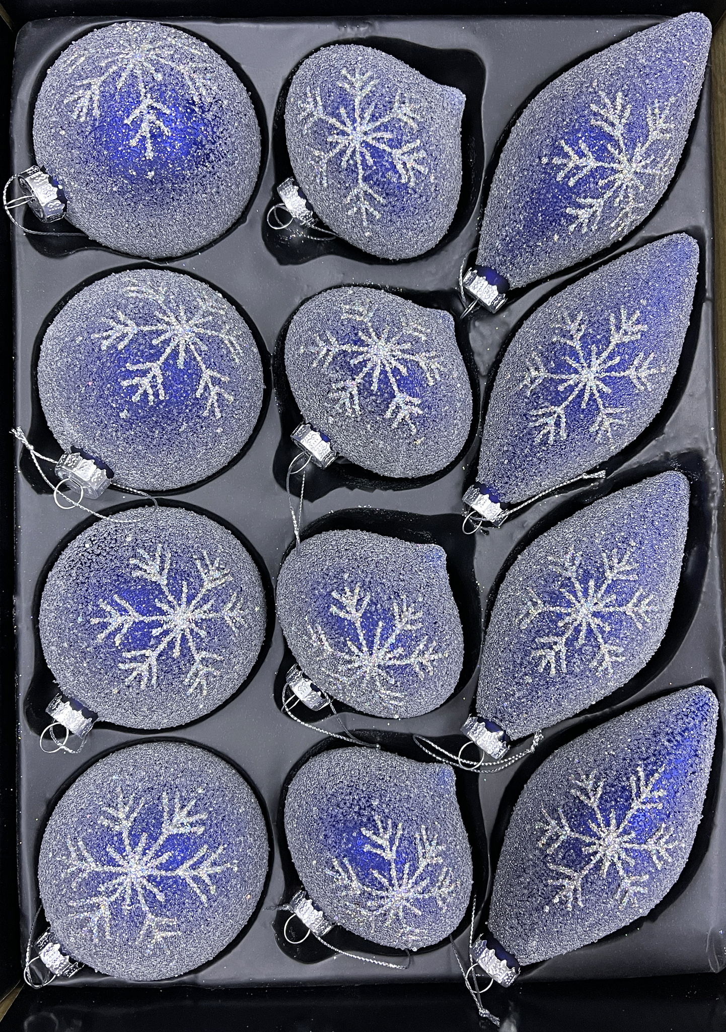 Набор стеклянных шаров синий в инее д.8 см, 12 штук, ассортимент из 3-х видов.