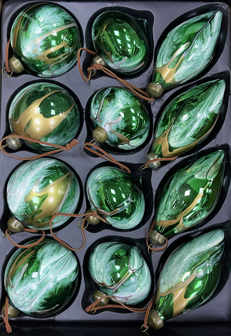 Набор стеклянных шаров зеленый с разводами д.8 см, 12 штук, ассортимент из 3-х видов.