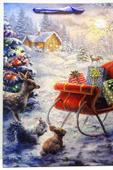 Новогодняя сумка люкс с дизайном, предназначена для новогоднего оформления подарков. Сумка выполнена из плотного картона, имеет новогодний рисунок с блестками, 44х12х30 см.