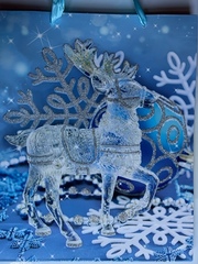 Новогодняя сумка люкс с дизайном, предназначена для новогоднего оформления подарков. Сумка выполнена из плотного картона, имеет новогодний рисунок Олень хрустальный с блестками, 32х26х10 см.