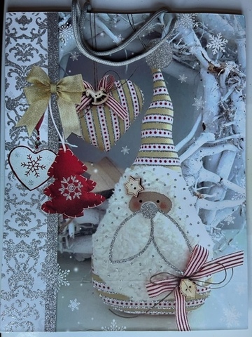 Пакет подарочный с дизайном Санта предназначена для новогоднего оформления подарков. Сумка выполнена из плотного картона, имеет новогодний рисунок Санты с блестками, 40х12х31 см.