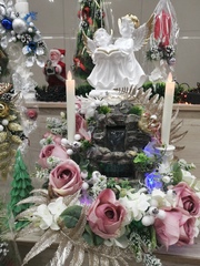 Новогодний декор, подарочная композиция в виде светильника декоративного "Фонтан со свечами и 2 ангелами" ручной работы, эксклюзив. Свечи с эффектом живого пламени, вода в фонтанчике падает каскадом и подсвечивается разными цветами за счет шара с лампами. данная декорация подключается к электросети 220-240, для придания праздничности используются дополнительно искусственные цветы и ветки. Такой подарок к Рождеству или Новому году станет незабываемым, дорогим и неповторимым! размер композиции 70х75 см.