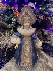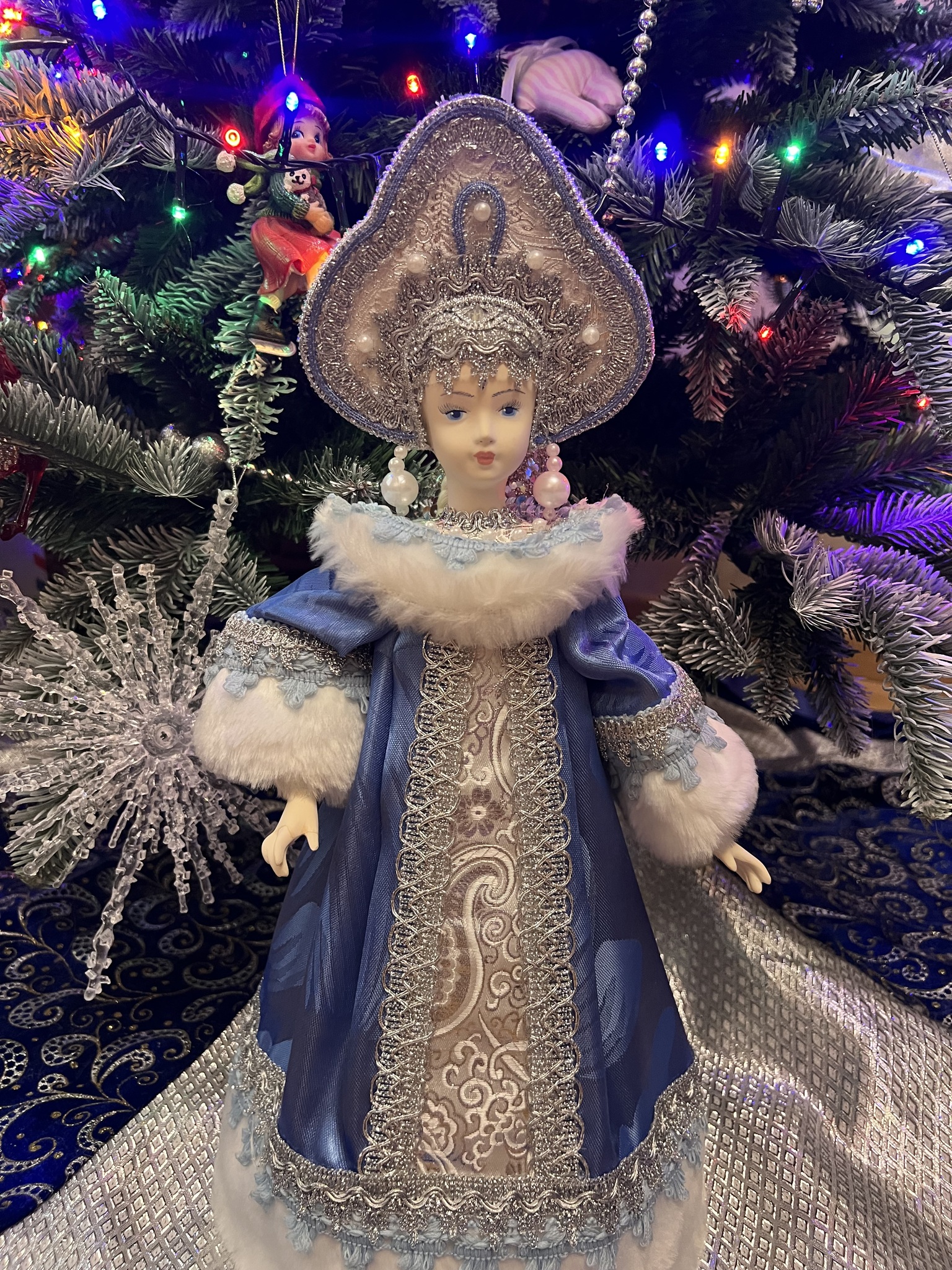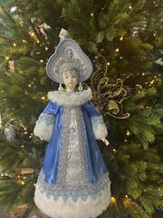 Снегурочка в голубой с серебром парчовой шубе и короне, 45 см. Среди символов Нового года в России особо популярна - Снегурочка. У подножия каждой Новогодней ёлочки, в каждом доме Вы найдёте важного дедушку в расшитой золотом шубе с роскошным посохом или мешком подарков. Рядом с ним, конечно, внучка-Снегурочка в парчовой шубке и элегантном кокошнике. Каждая наша фигурка индивидуальна и выполнена в единственном экземпляре. Фигурки отличаются высоким качеством ткани и прочих материалов и художественной ручной прорисовкой лиц. Также наши снегурочки являются фигуркой - сюрпризом, внизу изделия предусмотрена молния и вы можете спрятать туда подарок или использовать снегурочки в виде макушки на елку. Это очень качественные премиальные изделия ручной работы. Наши снегурочки останутся в семье на долгие годы.
