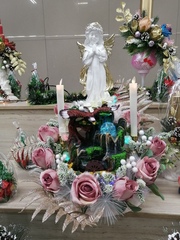 Новогодний декор, подарочная композиция в виде светильника декоративного "Фонтан со свечами и 1 ангелом" ручной работы, эксклюзив. Свечи с эффектом живого пламени, вода в фонтанчике падает каскадом и подсвечивается разными цветами за счет шара с лампами. данная декорация подключается к электросети 220-240, для придания праздничности используются дополнительно искусственные цветы и ветки. Такой подарок к Рождеству или Новому году станет незабываемым, дорогим и неповторимым! размер композиции 70х75 см.