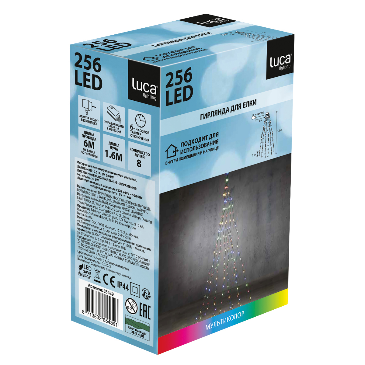 Светодиодная уличная электрогирлянда хвост Luca lighting 256 разноцветными LED огнями, зеленый провод провод 8 нитей, длина каждой нити 160 см, таймером на отключение 6/18 часов, контролером на 8 функций, IP44, длина подводящего провода до розетки 3м.