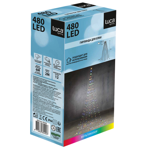 Светодиодная новогодняя гирлянда Luca Lighting представляет собой новейшую сверхнадёжную новогоднюю электрогирлянду в виде хвоста с 480 разноцветными LED огнями. Зеленый провод длиной 200 см оснащен 12 лучами, каждая из которых имеет длину 200 см.