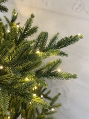 Новогодняя искусственная елка торговой марки TreeDeLux Ель Королевская литая 260 см с 1550 led лампами теплого белого цвета, 8 функций смены режима свечения. Елка выполнена из пожаробезопасного материала, цвет и форма игл очень правдоподобно имитирует натуральную иглу искусственной елки - тонкие иглы из литой резины натурального зеленого цвета чуть более светлые к концам, у ствола для придания обьема добавлены иглы, выполненые из пвх зеленого цвета. Сквозь хвою едва просечивает древесина цвета, как у настоящего лесного дерева. Ствол и сами веточки обмотаны пленкой пвх, а крепление веточек к основным веткам обмотаны шелковой нитью. Основные ветки прикреплены к стволу на крючках, достаточно вытащить из коробки елку, установить подставку, вставить в нее елку, ствол которой состоит из 3 частей и ветки откидываются, соединить контакты у гирлянды между частями ствола и подключить светодиодную гирлянду к электросети. В комплекте к елке идет металическая подставка. Торговая марка TreeDeLux-это 10 лет гарантии на данную модель и соответствие международным стандартам качества. Поставляется елка в коробках из плотного картона, предполагающих многолетнее хранение. На каждой коробке нарисована инструкция по сборке и фотографии ели, так как она должна выглядеть в собранном виде.