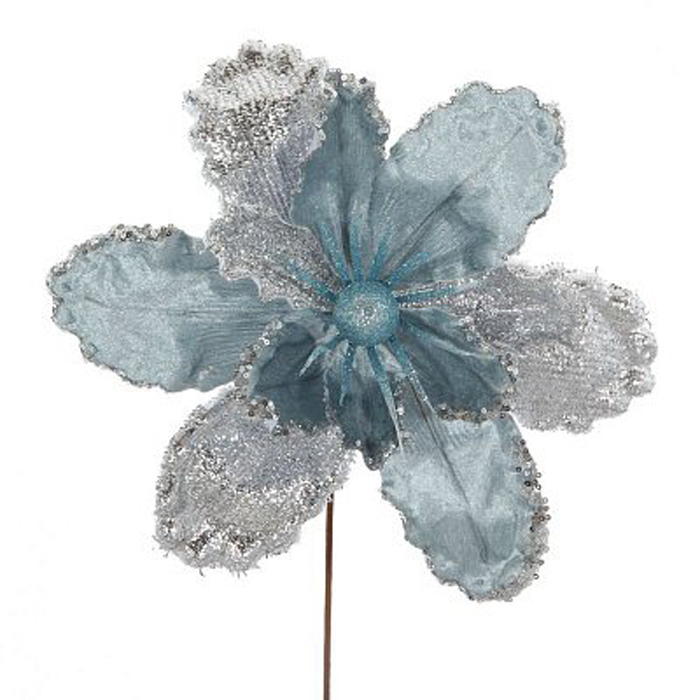 Очень красивый искусственный цветок на ножке для декорирования. Выполнен из ткани (полиэстер) голубого и серебрянного цвета. Размер цветка 35 см.
