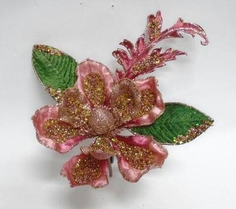 Очень красивый искусственный цветок для декорирования магнолия розовая на клипсе. Выполнен из ткани - полиэстер розового цвета. Размер цветка 20 см.
